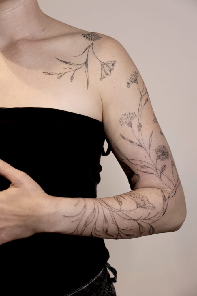 Ich habe mir ein Fineline Floral Freehand Tattoo über die Schulter stechen lassen, und das Ergebnis ist einfach wunderschön! Ich kann mich kaum sattsehen. Ihre Präzision und Kunstfertigkeit sind wirklich beeindruckend.